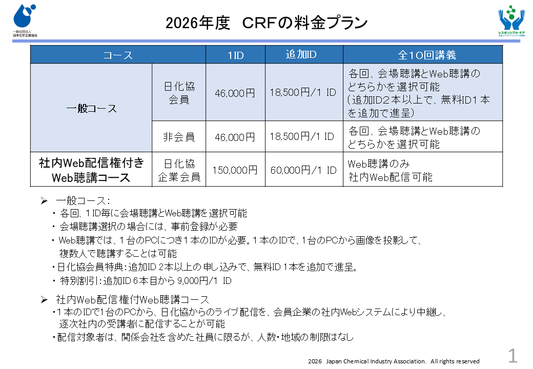 - 一般コースでWEB聴講での受講の方は、申し込みの必要はありません。 事前にケミカルリスクフォーラムのホームページの会員様専用メニュー(会員IDでログインが必要です)より、テキストをダウンロードの上、受講してください。